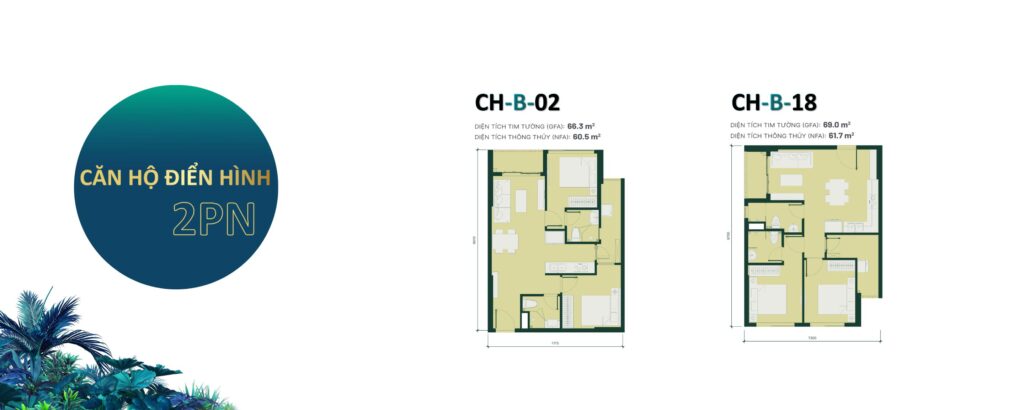 | Căn hộ 2PN + 2WC | 66m² – 69m² | |