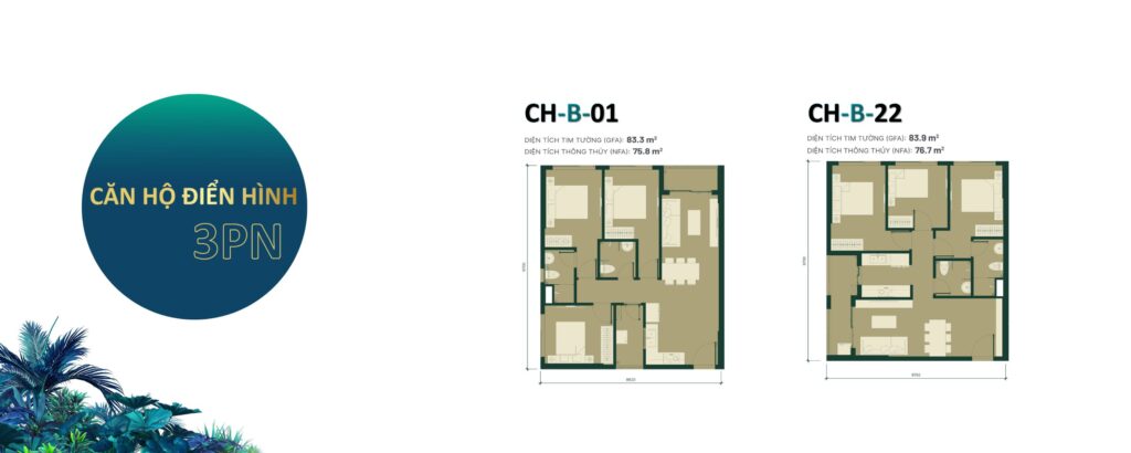 | Căn hộ 3PN + 2WC | 83m2 |